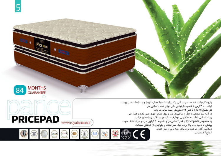 پد مخصوص(PricePad) با قطر 4 سانتی متر و دانسیته 30 کیلویی در دو طرف تشک برای پوشش 7 ناحیه بدن، بالا بردن طول عمر تشک و جلوگیری از گرفتگی عضلات